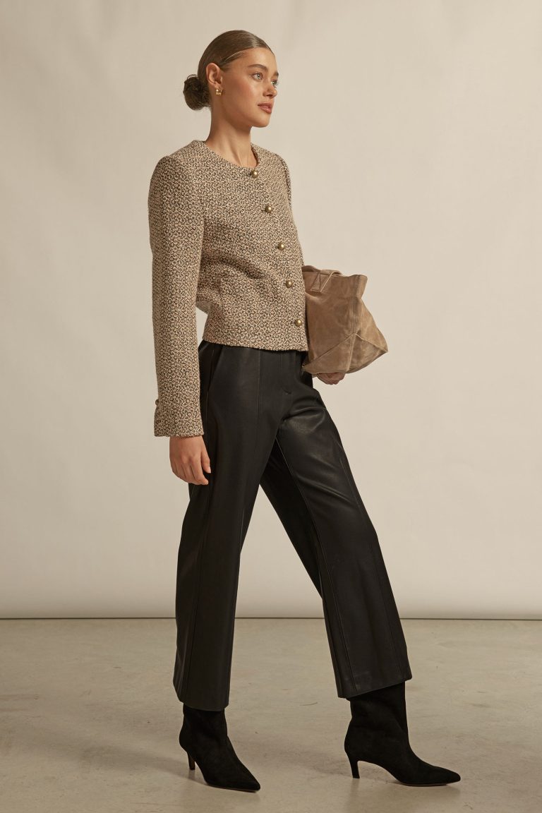 The Cinder Jacket by Zoe Kratzmann brings balance to everyday dressing with its slightly cropped silhouette and beautifully tailored finish. Crafted in a textured wool blend with a refined tonal weave, it offers warmth without heaviness. A delicate round neckline creates a clean, elegant line, while brushed-brass dome buttons add subtle distinction. Streamlined pocket detailing maintains the jacket’s polished aesthetic, and a fully lined interior with gentle stretch ensures comfort throughout the day. Designed to layer seamlessly over blouses, dresses or fine knits, this is an elevated outer layer that transitions effortlessly from workday to weekend.