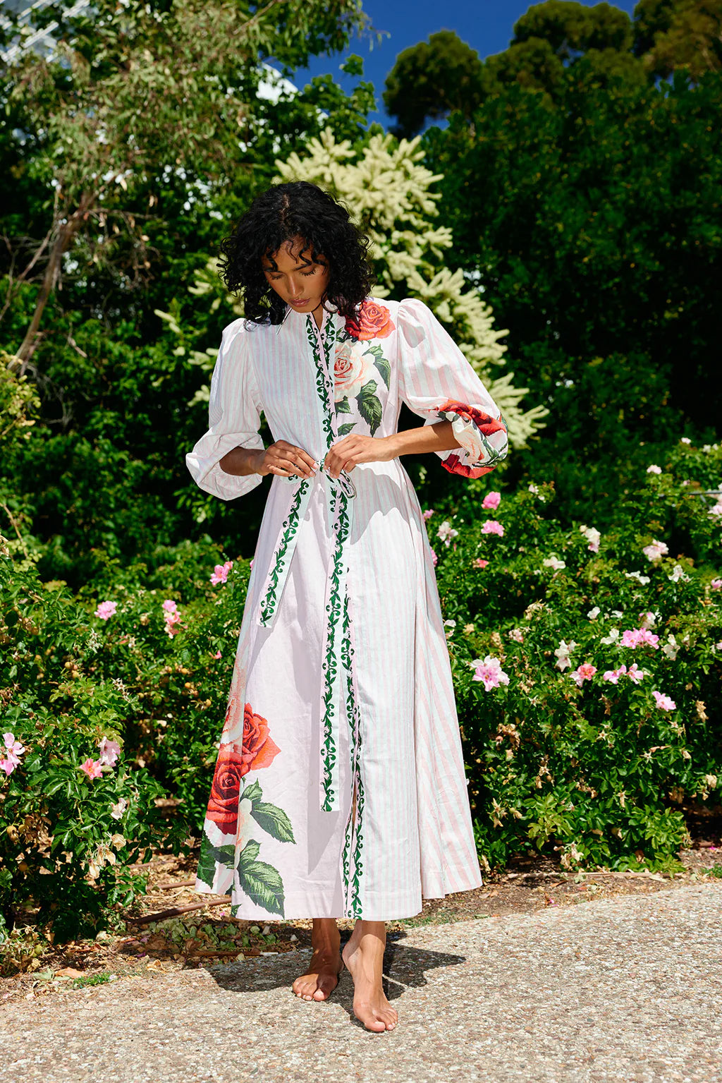 The Lucille Dress is a relaxed shirtdress in our exclusive Baby Rose Multi print. Crafted with a premium linen cotton blend this dress is timeless and designed for comfort.